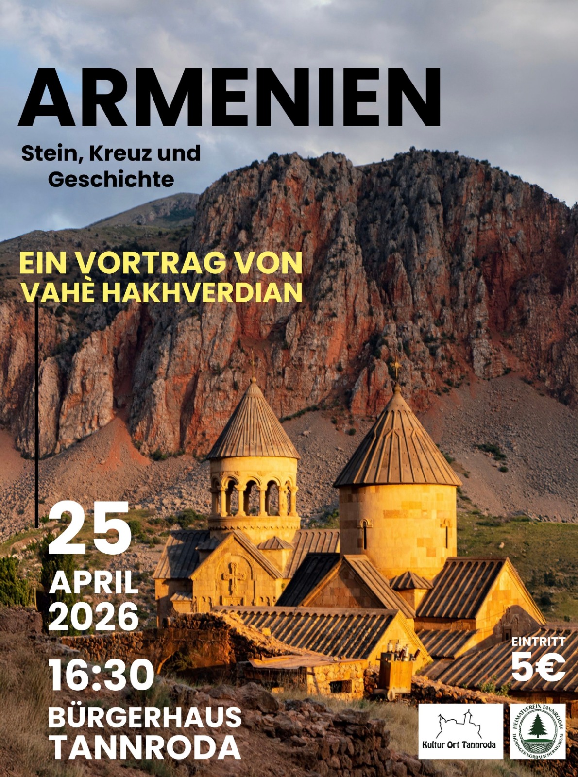 Im Anschluss um 16:30 Uhr findet ein Vortrag über Armenien, gehalten von Vahe Hakhverdian, im Bürgerhaus Tannroda statt.